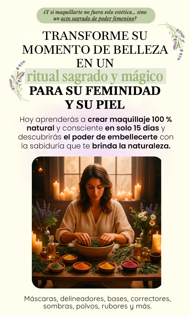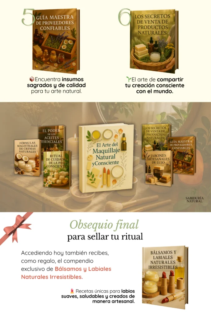 Incluye el ebook principal “El Arte del Maquillaje Natural y Consciente” con todas las fórmulas y técnicas + 7 Regalos exclusivos.